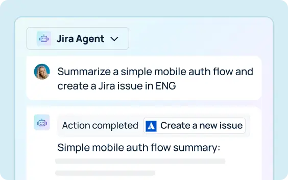 Extend agent capabilities with custom actions that trigger workflows, call APIs, and interact with tools like GitHub, Jira, or Slack. Actions let agents retrieve data, update records, or complete tasks directly in external systems—no manual steps required.