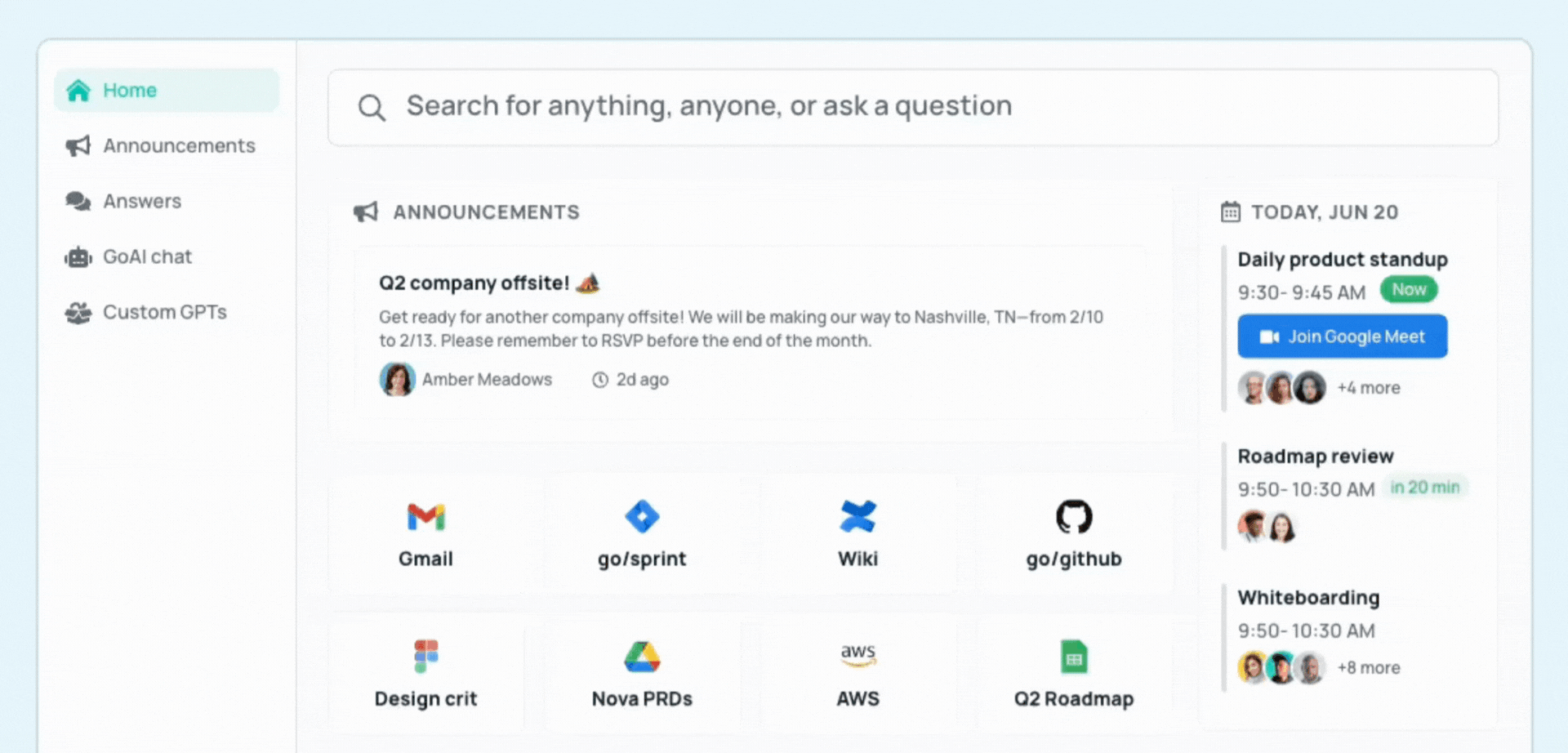 These go links let you share knowledge visually or verbally with team members. For instance, HR could tell you to check go/401k for updated information about retirement benefits. These links put company-wide knowledge assets at your fingertips, saving you time and navigational headaches.