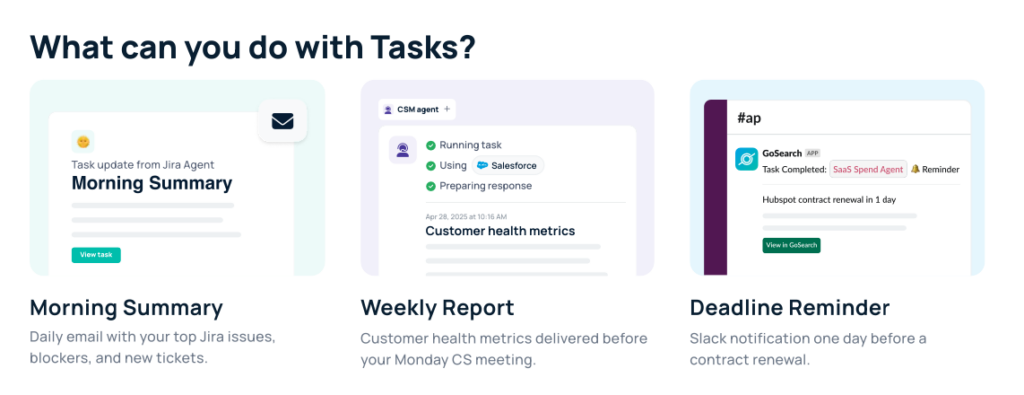 GoSearch Tasks let you schedule AI agents to automatically deliver information or take action, continuously and reliably. From daily summaries to weekly reports, GoSearch ensures you always get the right update, in the right place, at the right time.