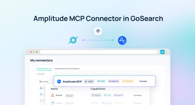 The Amplitude MCP Connector for GoSearch enables AI to securely access product analytics and behavioral insights in real time. Instead of copying or indexing analytics data, GoSearch agents consult Amplitude directly through structured, permission-aware access. As a result, organizations can coordinate AI-driven workflows across more than 100 enterprise systems while grounding decisions in trusted product intelligence.