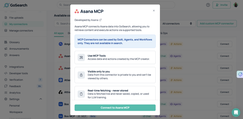 GoSearch provides a unified platform for deploying and managing MCP servers across the enterprise. By connecting Asana with more than 100 enterprise systems, GoSearch enables AI agents to reason over work management data and coordinate action across tools — project management, engineering, sales, finance, HR, and more — under a single governance layer.