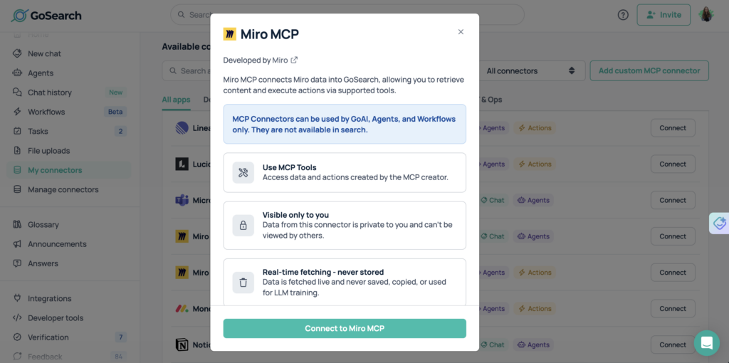 GoSearch provides a unified platform for deploying and managing MCP servers across the enterprise. By connecting Miro with more than 100 enterprise systems, GoSearch enables AI agents to reason over visual collaboration content and coordinate action across tools — product, engineering, project management, communication, and documentation — under a single governance layer.