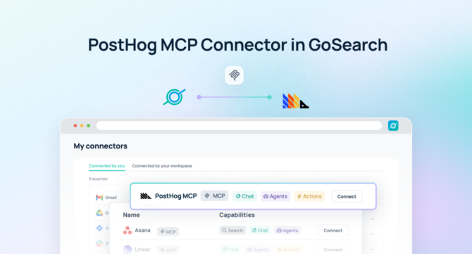The PostHog MCP Connector for GoSearch enables AI agents to securely access product analytics and experimentation data in real time. Instead of copying or indexing data, GoSearch agents consult PostHog directly through structured, permission-aware access. As a result, organizations can coordinate AI-driven workflows across more than 100 enterprise systems while grounding decisions in trusted product intelligence.